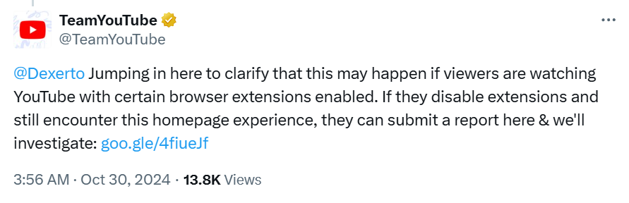 Hari ini, akun resmi @TeamYouTube merespons postingan @dexerto dengan mengatakan bahwa perubahan tampilan tersebut mungkin terjadi karena penonton menggunakan YouTube dengan ekstensi browser tertentu.