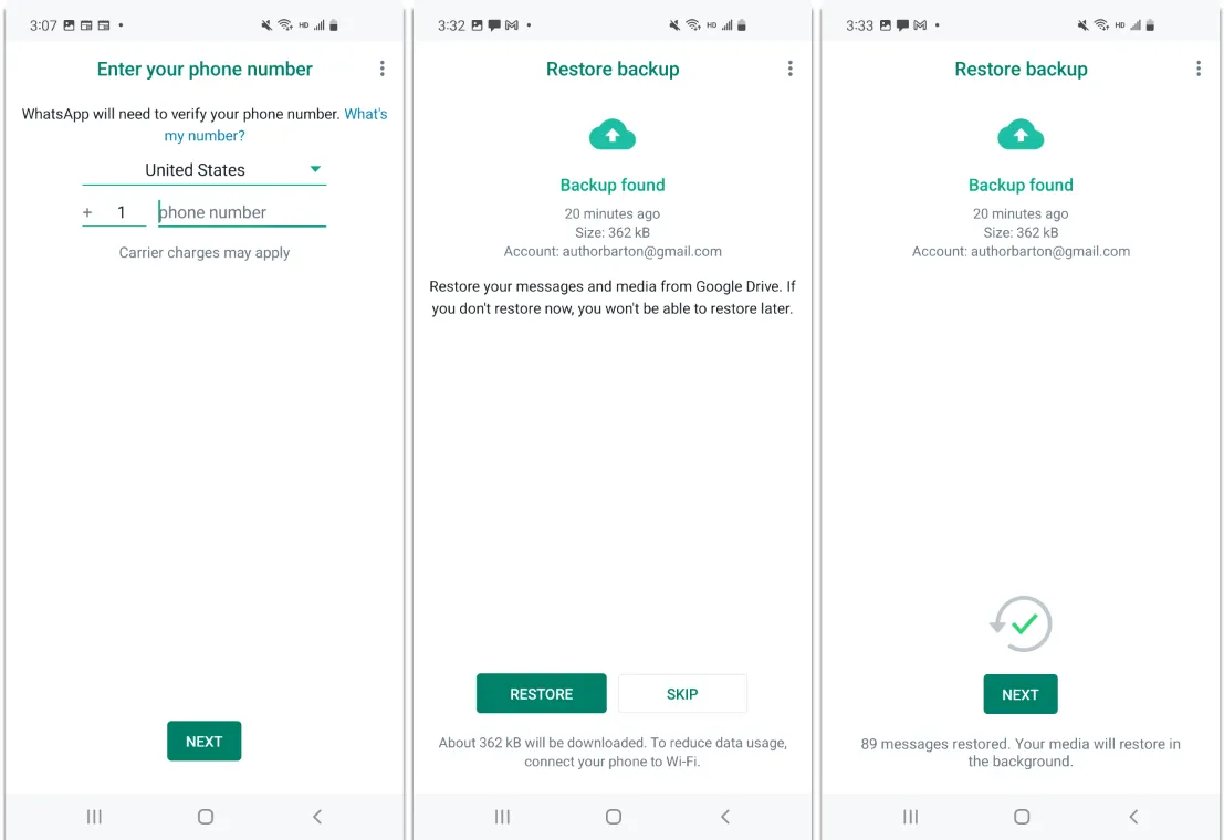 - Android ke Android: Pastikan HP baru sudah login ke akun Google yang sama. Instal WhatsApp, verifikasi nomor telepon yang sama, lalu pilih Pulihkan/Restore saat muncul notifikasi pencadangan Google Drive.