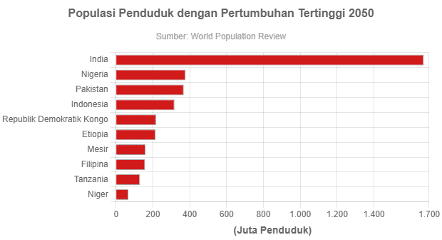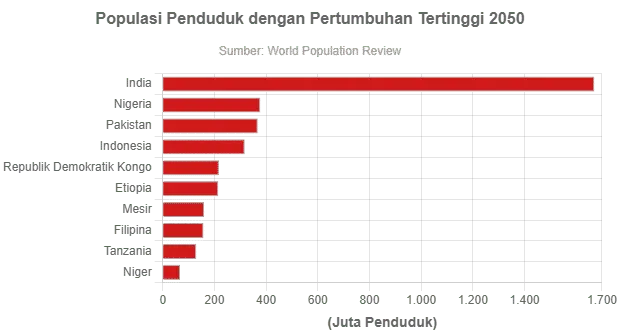 Urbanisasi global menunjukkan proyeksi pertumbuhan populasi di berbagai negara hingga tahun 2050 dengan satuan juta penduduk. India menempati posisi teratas dengan proyeksi populasi mendekati 1,7 miliar jiwa, menjadikannya negara dengan pertumbuhan penduduk tertinggi di dunia, di bawahnya Nigeria dan Pakistan menyusul dengan angka yang juga signifikan, menunjukkan lonjakan demografi yang pesat di kawasan Asia Selatan dan Afrika Sub-Sahara