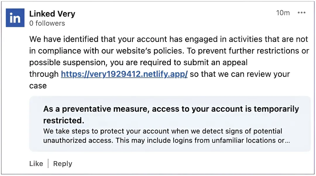 Setelah berhasil mencuri data log masuk, pelaku dapat mengambil alih akun korban untuk menyebarkan penipuan lebih lanjut kepada jaringan koneksi korban, menciptakan rantai serangan yang sulit diputus. Informasi yang dicuri tidak hanya terbatas pada akses akun LinkedIn saja. Dalam beberapa kasus, situs web palsu tersebut juga mencoba menanamkan perangkat lunak berbahaya atau malware ke perangkat pengguna.