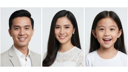 “Gunakan dua foto ini untuk membuat prediksi wajah anak laki-laki usia 10 tahun dengan ekspresi senyum tipis, mata hangat, dan pencahayaan lembut studio. Format landscape, latar polos krem.”