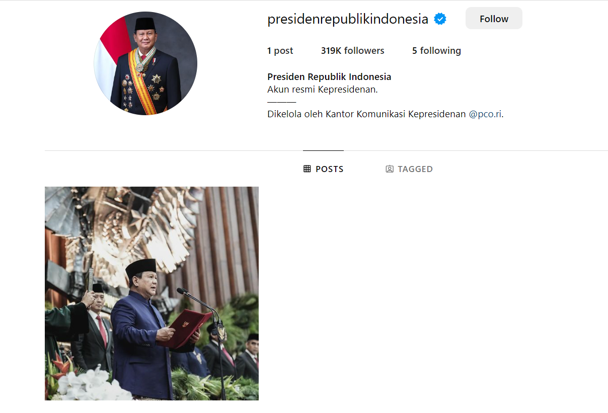 Tak hanya itu, Presiden Prabowo Subianto yang baru saja dilantik juga dibuatkan akun Instagram resmi dengan nama pengguna @presidenrepublikindonesia, yang dikelola langsung oleh Istana. Akun ini telah diverifikasi dan hingga saat ini telah memiliki 319 ribu pengikut.